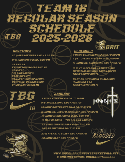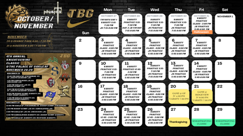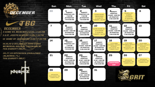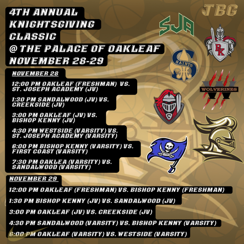 League Game Days: November 28 vs. St. Joseph Academy 12:00 pm (noon) @ Oakleaf (KnightsGiving Classic)