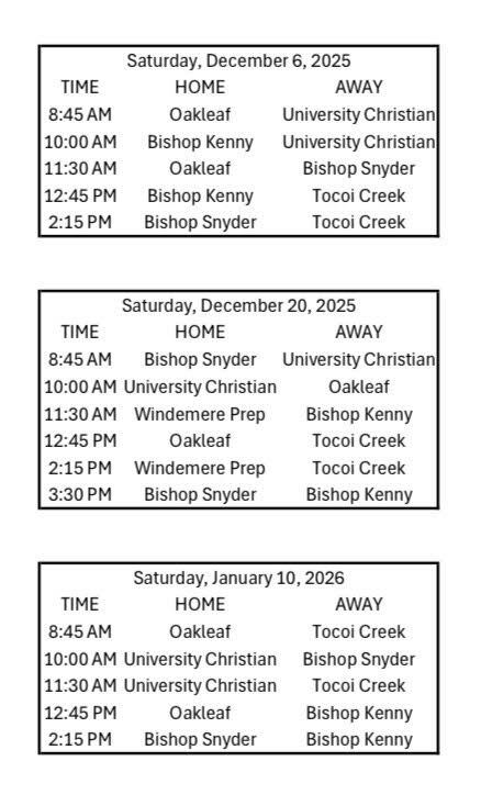 November 29 vs. Bishop Kenny 12:00 pm (noon) @ Oakleaf (KnightsGiving Classic)